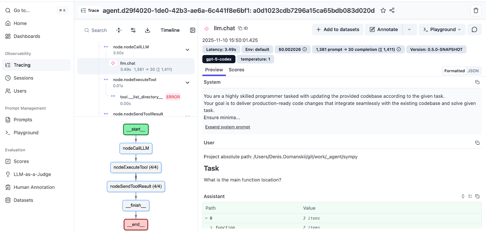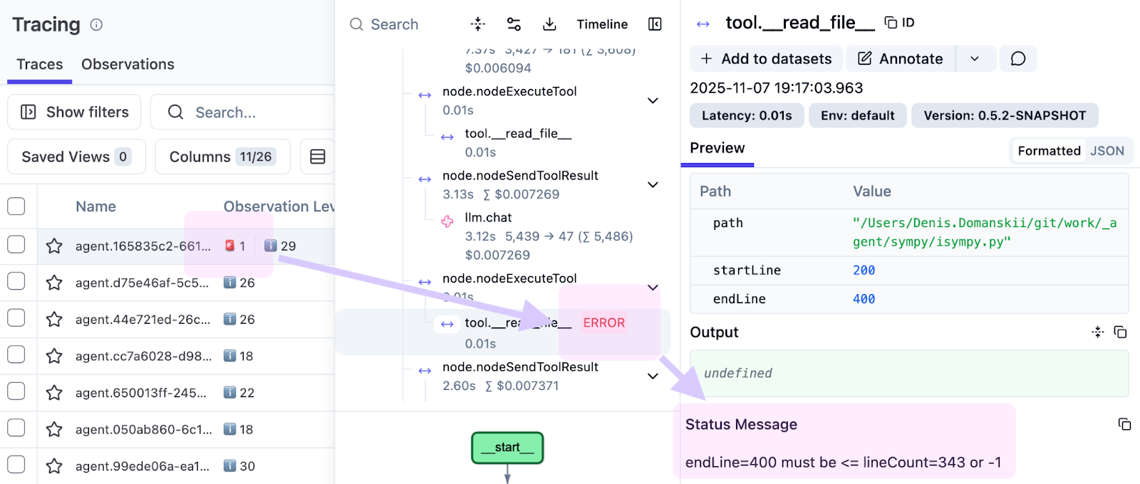 The agent requested lines 0–400, but the file had only 394 lines. This points to a limitation in our tool implementation. Instead of failing, it should clamp the range and return the available lines (0–394), allowing the agent to continue. Without traces, this kind of issue often gets buried in logs. With traces, you see it in the exact run, at the exact step, and with the exact input.