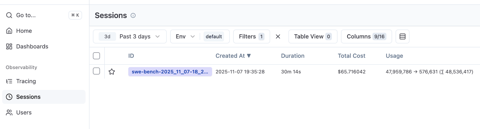 When you run your agent across multiple SWE-bench Verified tasks (a standard benchmark for coding agents), you want grouped traces and aggregated cost.