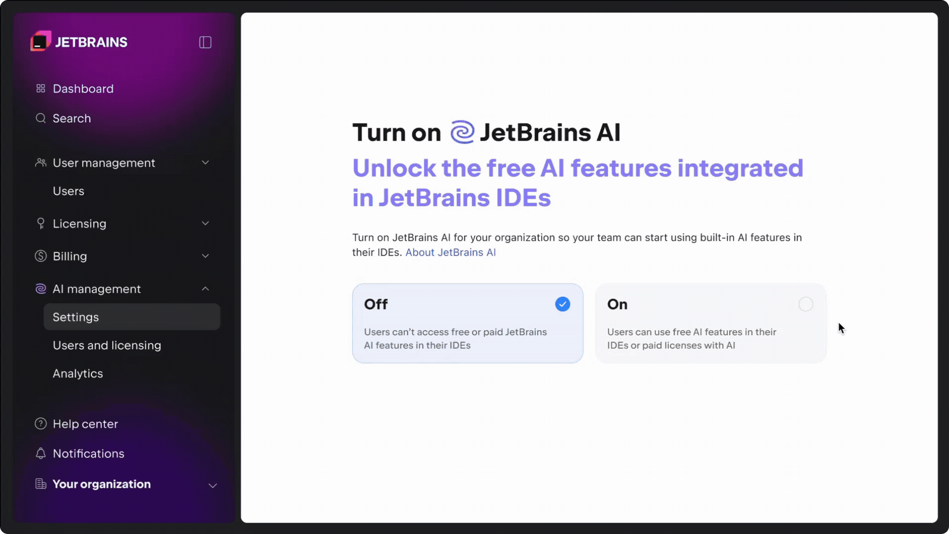 To get started, open the AI management section in the JetBrains Console. For more details, refer to the documentation or visit the AI for Business page.