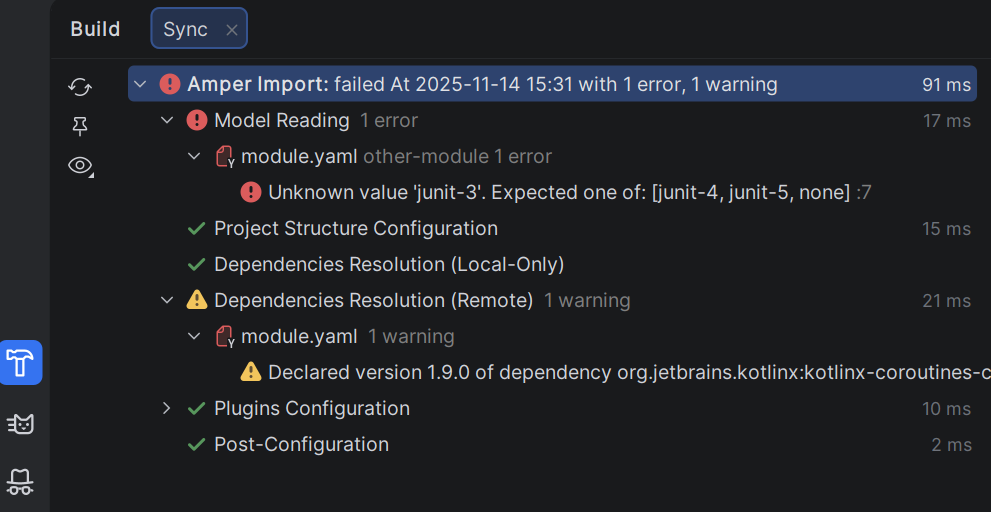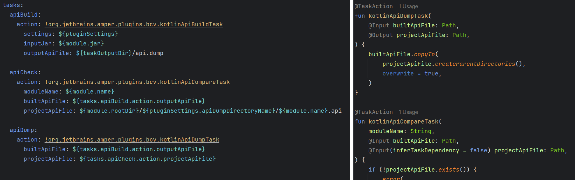 Why do you need to use both Kotlin and YAML? As usual with Amper, tooling is paramount. Thanks to this approach, you will get nice diagnostics in case you make mistakes with your task wiring. Don’t worry, though, navigating between YAML and Kotlin is already seamless with the current basic IDE support.