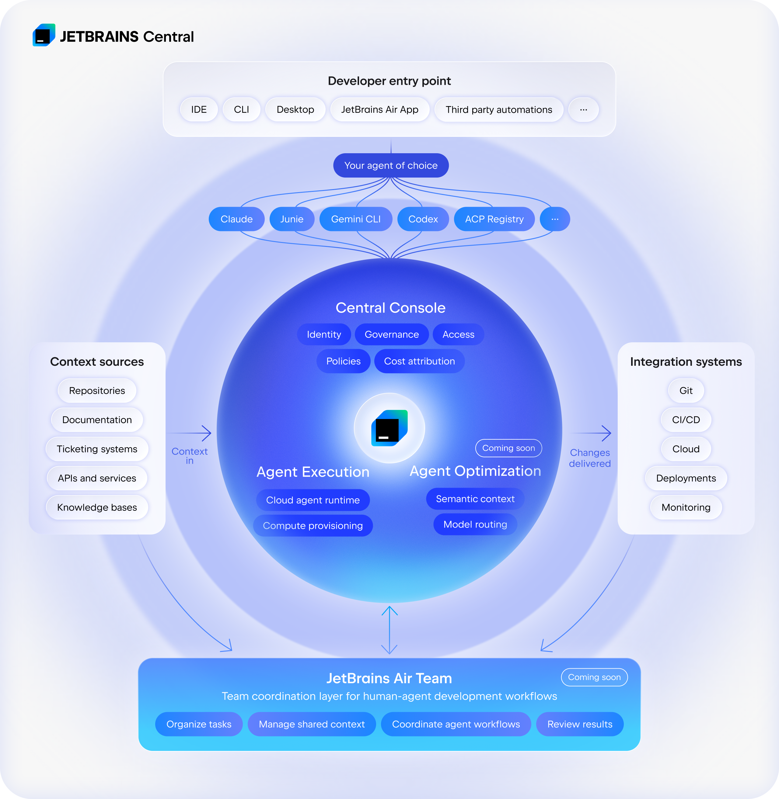 Policy enforcement, identity and access management, observability, auditability, and cost attribution for agent-driven work. Some of these functionalities are already available via the JetBrains Central Console.