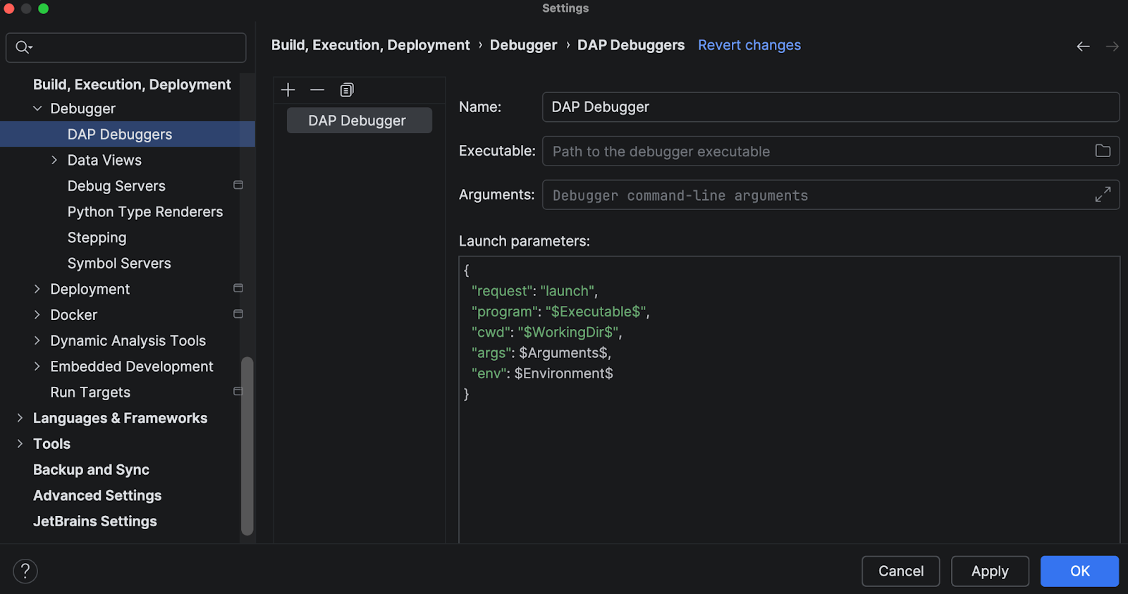 - Go to Settings | Build, Execution, Deployment | Debugger | DAP Debuggers.