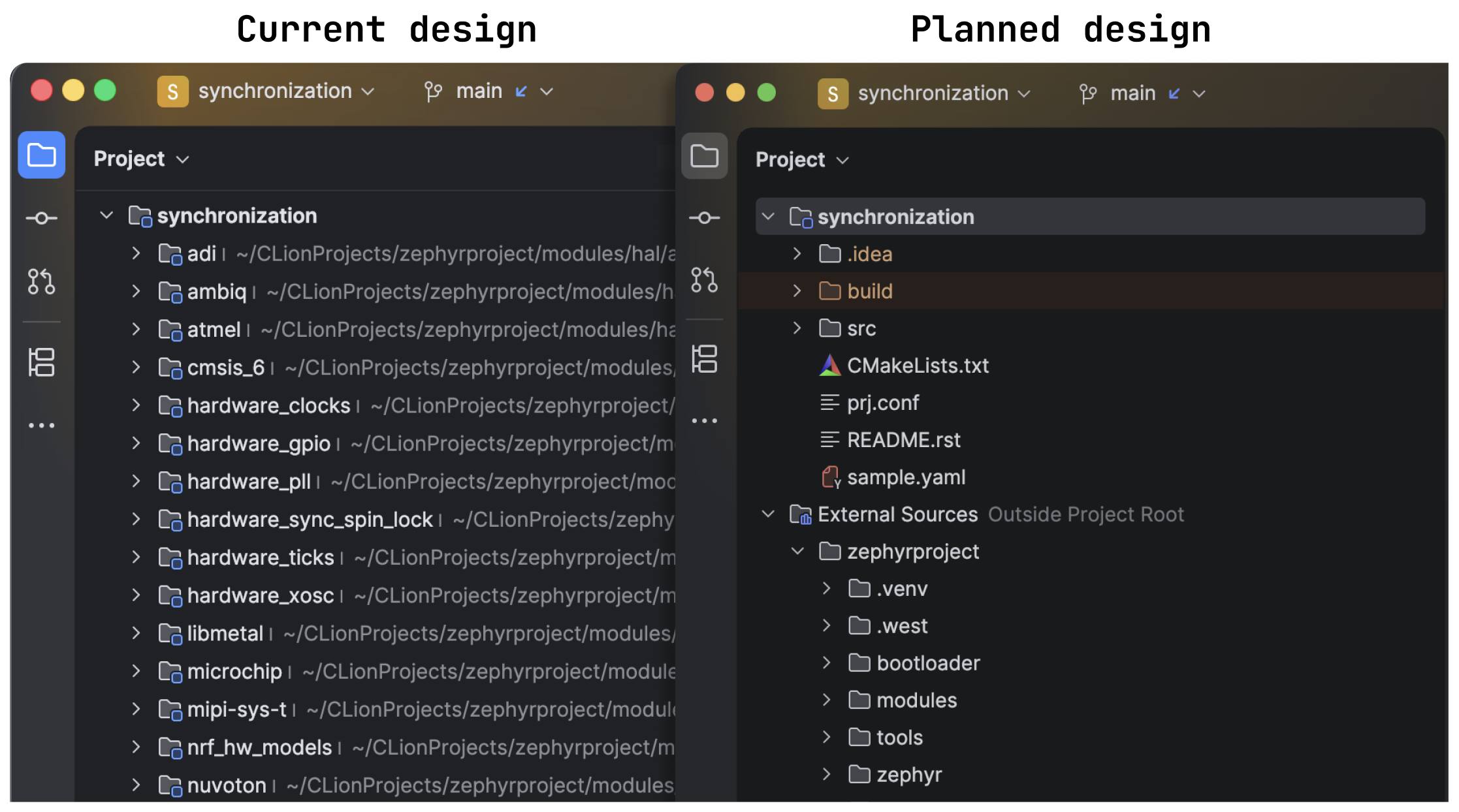 When working with source files or folders outside of your root project, the IDE displays them in the same folder as your root project sources in the Project tool window. This works fine if all the sources have unique names. However, when external sources share names with project root sources and their paths are long, it can be difficult to distinguish between them. This is often the case for embedded developers working on projects that require external libraries and files, like Zephyr ones. For the next release, we plan to add a separate node to group all external sources, making it easier to distinguish them from internal sources.