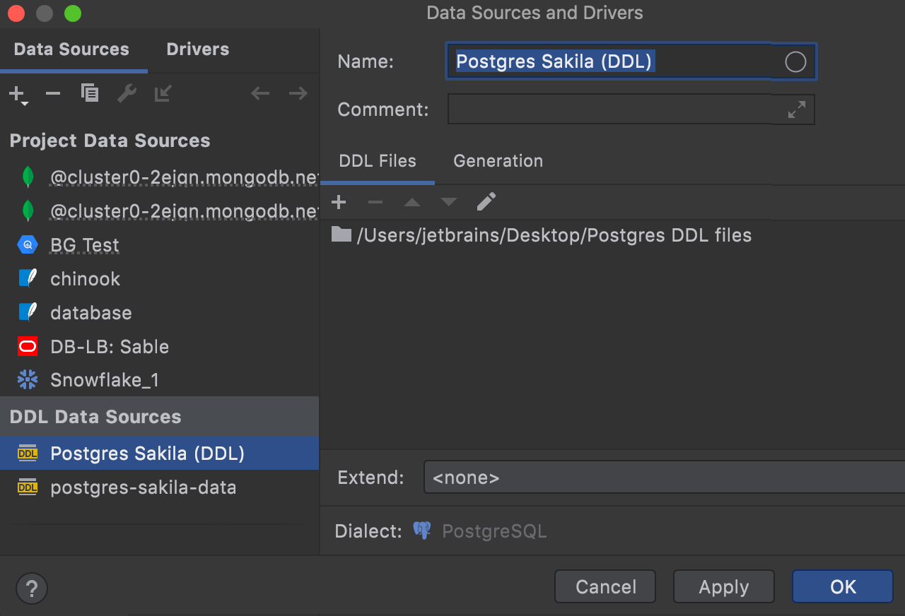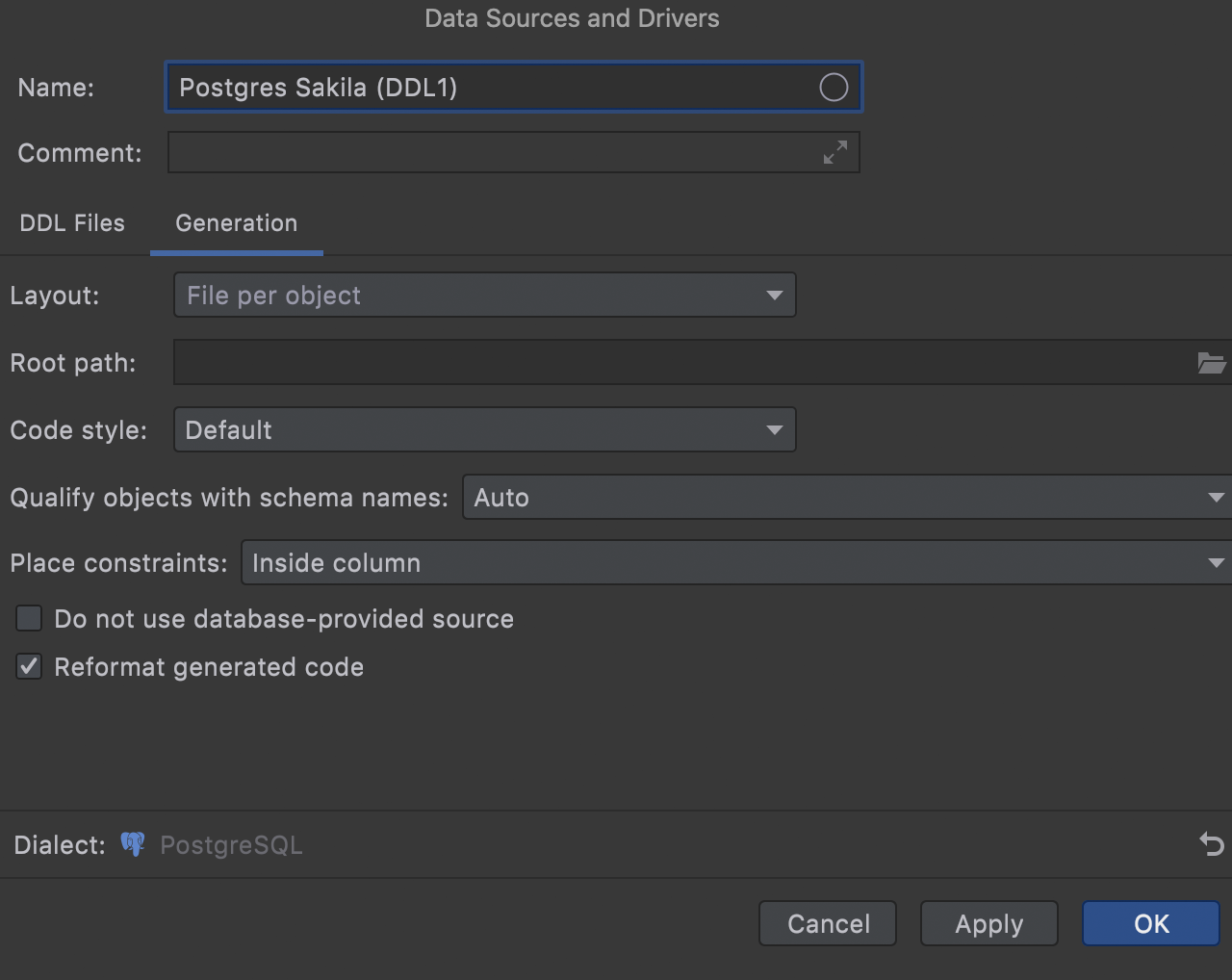 DDL data source generation is another step in our long-term development of seamless database versioning. With this feature, you can keep your DDL files under a VCS system and regenerate them every time your database structure is updated.