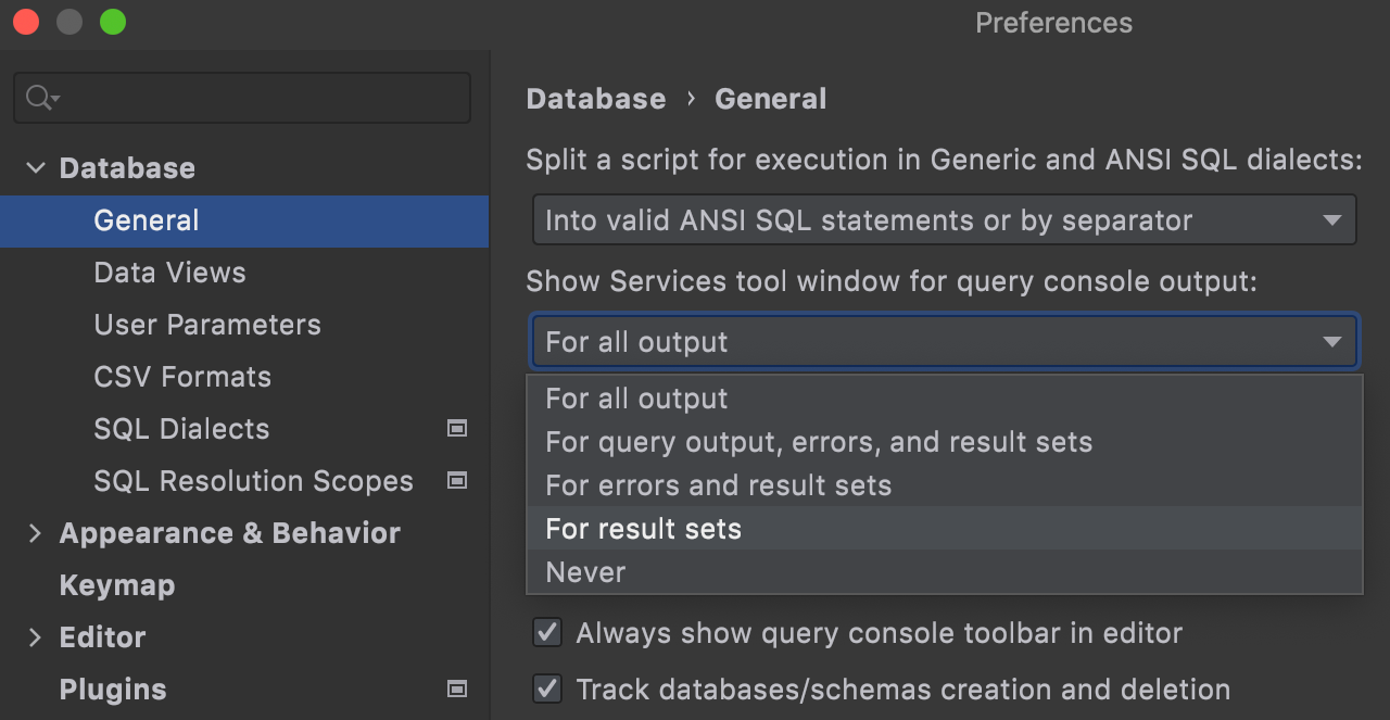 When a query returns no data, there’s no need for the Services tool window to appear if it was hidden already. Now you can define which operations make the Services tool window appear on your own.