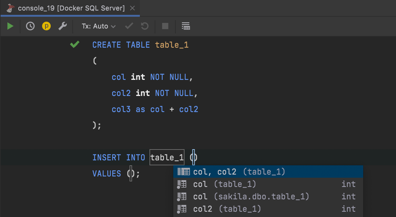Computed columns are taken into account when completing INSERT statements – they are not included in the suggested item.