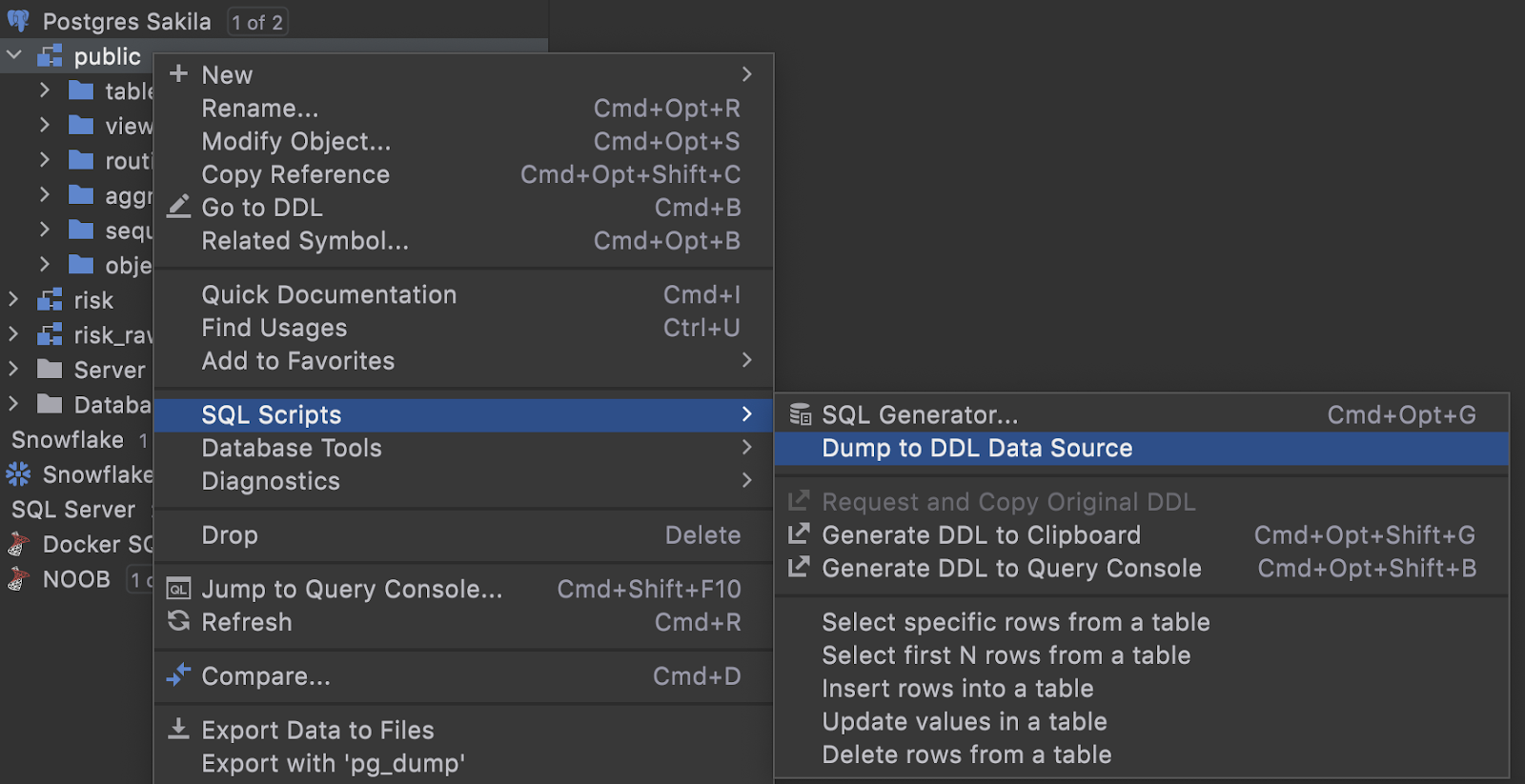 The new menu item Dump to DDL data source is added to the SQL Scripts context menu.