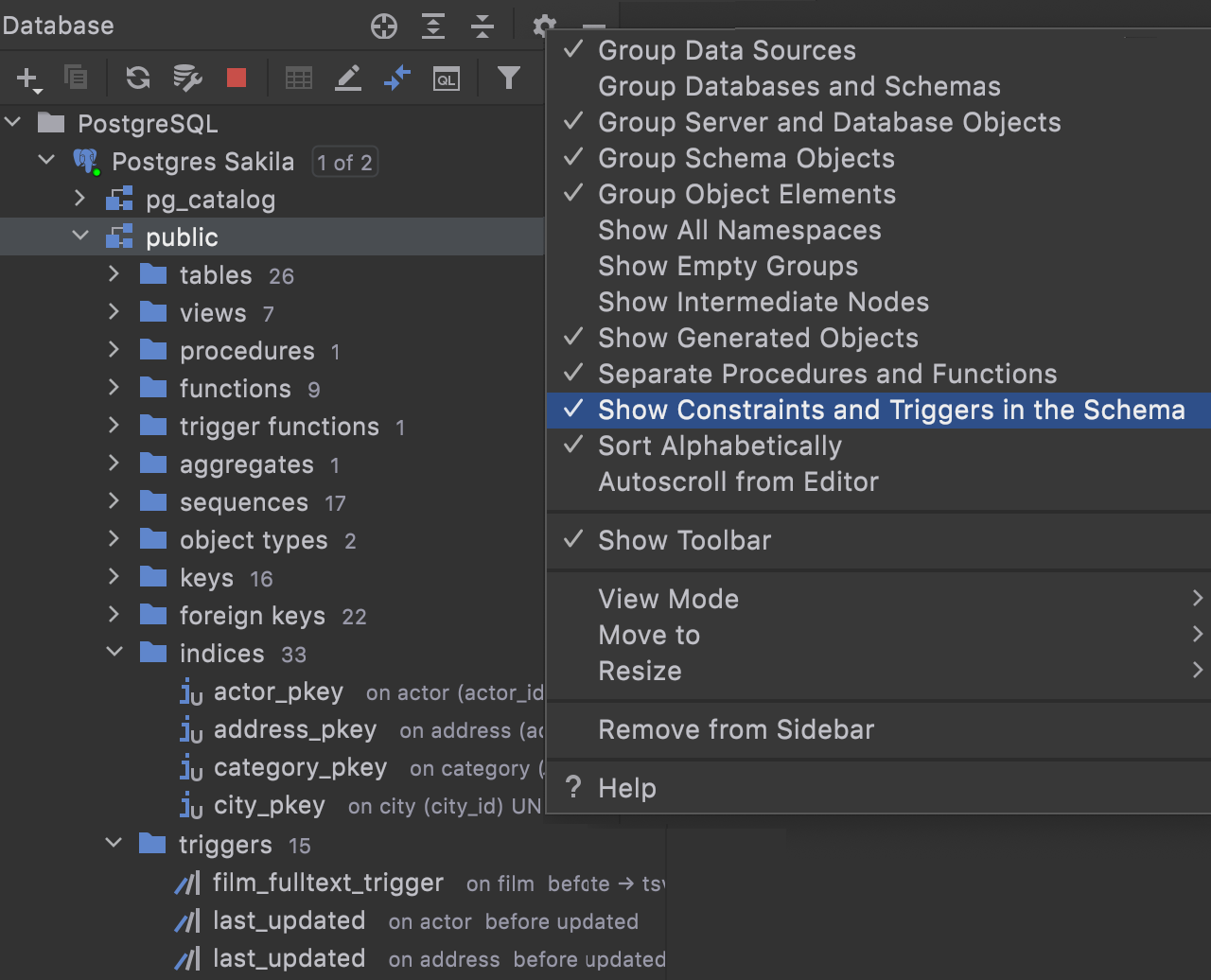 The new database tree option called Show Constraints and Triggers in the schema gives the separate nodes for triggers, keys, and indices.
