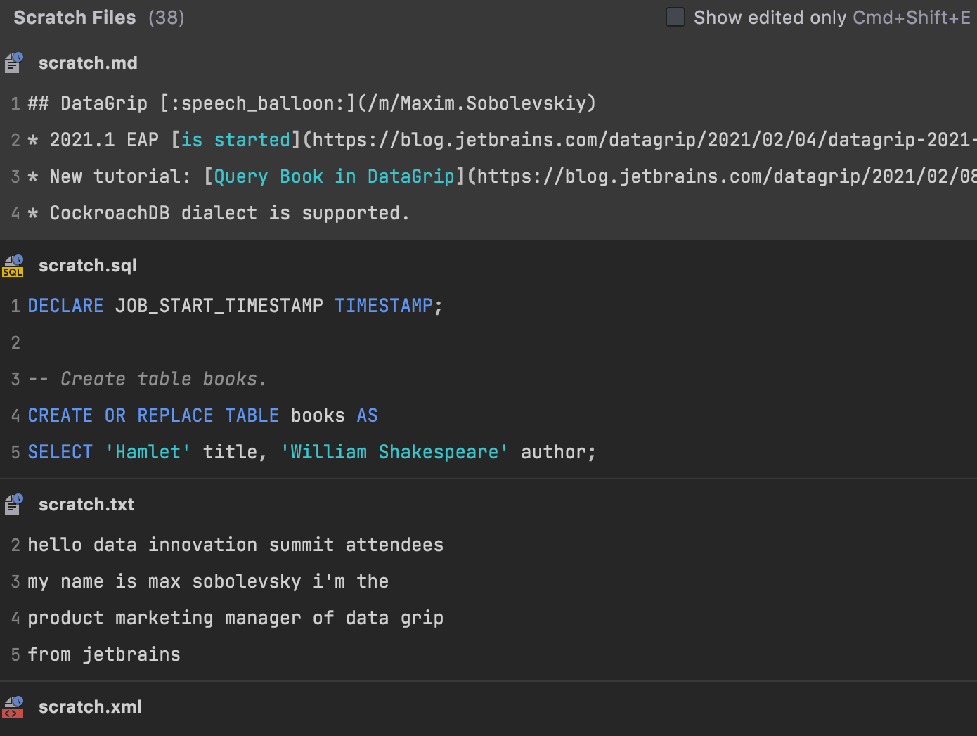 A new Show Scratch Files action (found via Find Action: Ctrl/Cmd+Shift+A) shows a list of scratches with snippets in a popup. It has the same UI as the Recent Locations popup with speed-search and deletion.