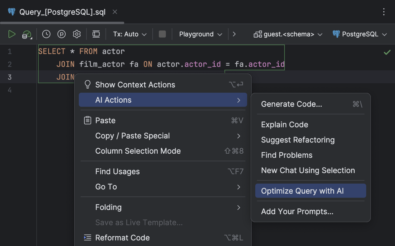 For a query execution plan, AI Assistant can explain it to you and also suggest optimizations using the new AI-based explanation and optimization features. Explanations and suggestions are provided in the chat, where you can also ask any additional questions you might have about the plan.