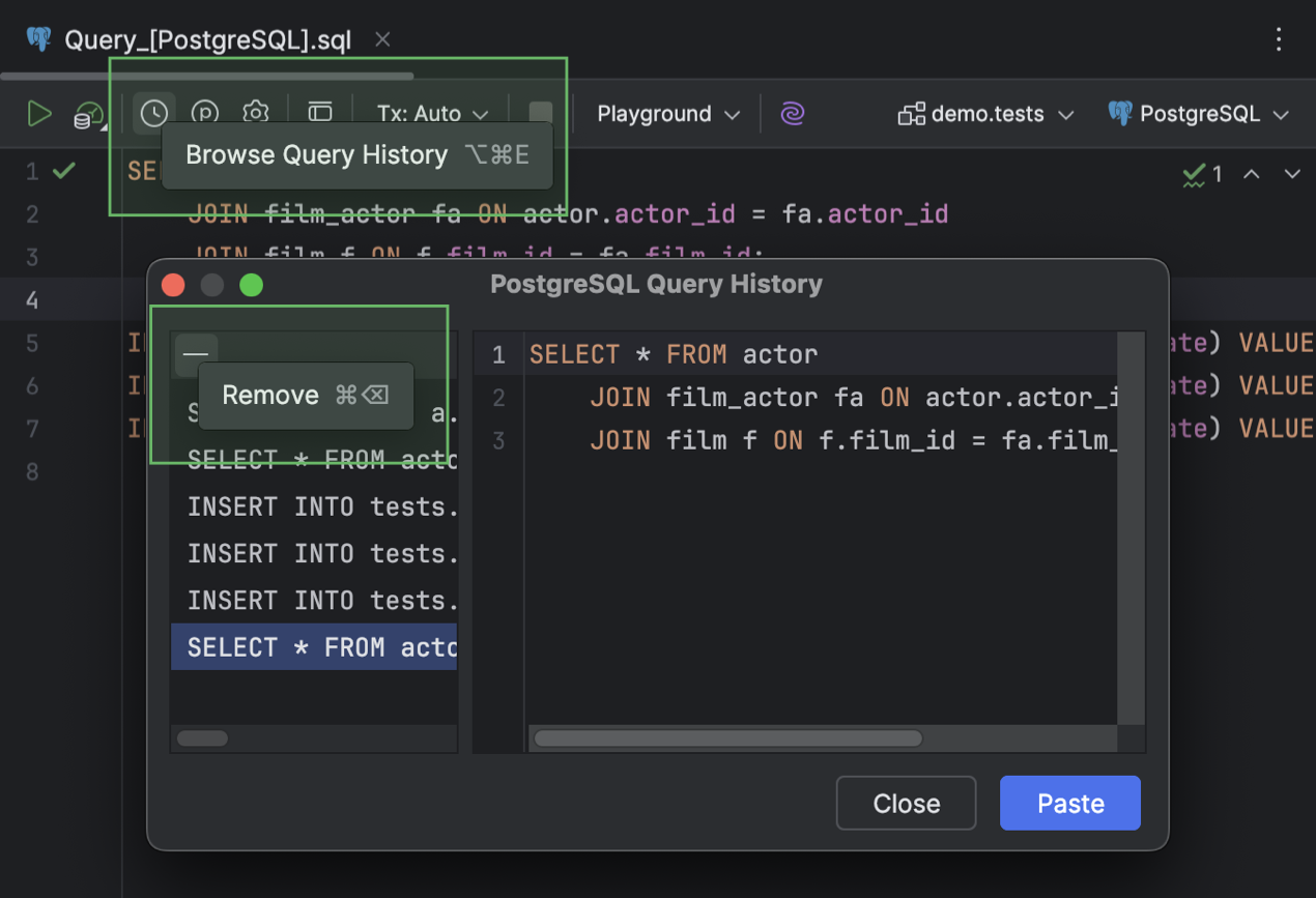 DataGrip keeps track of the queries you run in files. The Query History dialog that stores them can be opened in any code editor tab if the file has an attached data source. Now, you can remove any record from the record list in this dialog.