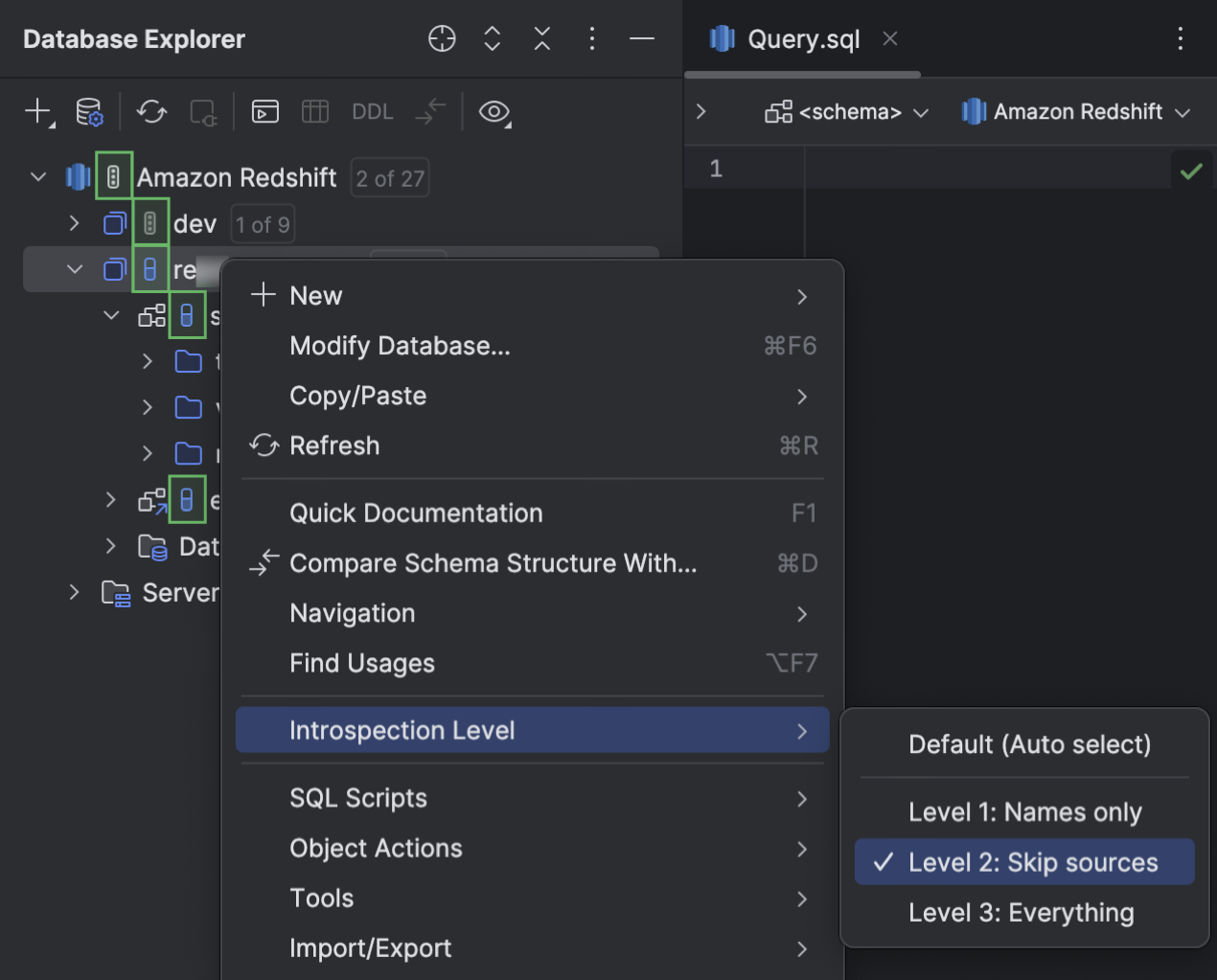 We’ve made the introspection levels feature available for Amazon Redshift databases. It allows DataGrip to automatically adjust the amount of loaded metadata based on the database size.