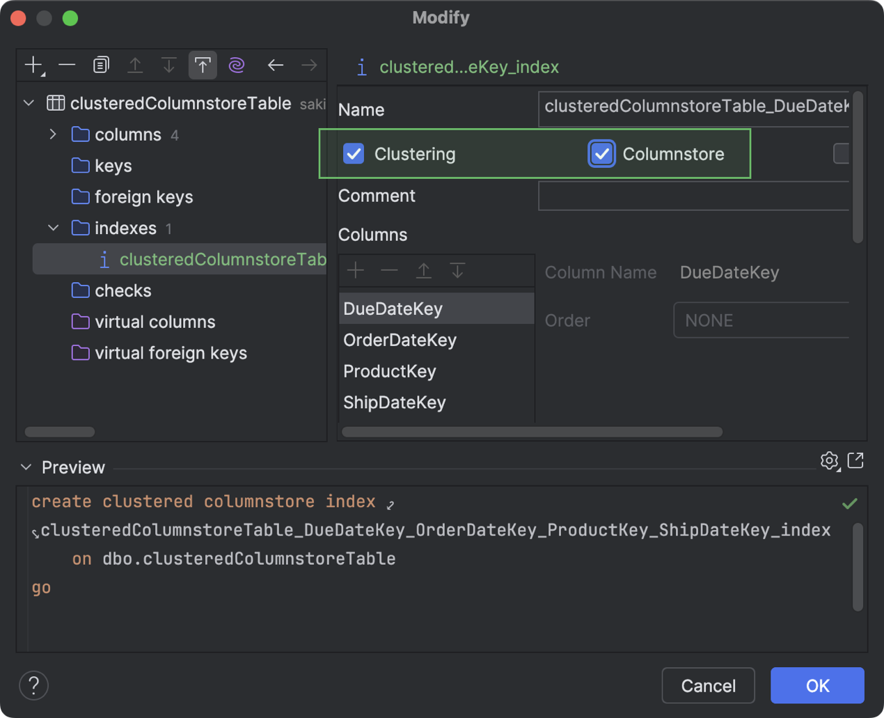 For Microsoft SQL Server, we’ve introduced support for clustered and nonclustered columnstore indexes, as well as the VECTOR and JSON data types. You can work with them in the Create and Modify dialogs. The data types are also available in code completion suggestions, and they are highlighted properly in the code editor.