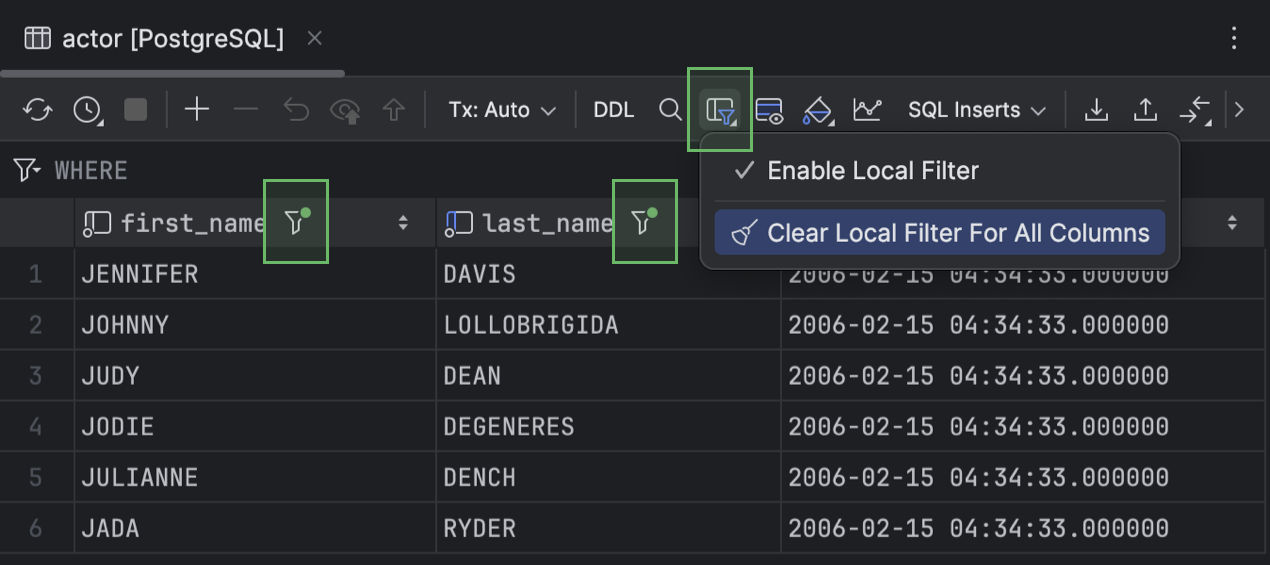 We’ve made it easier to access the action that clears local filters for a grid. In the latest version of DataGrip, to clear the local filter for all columns, click Table Result Local Filter on the data editor toolbar and then click Clear Local Filter For All Columns.