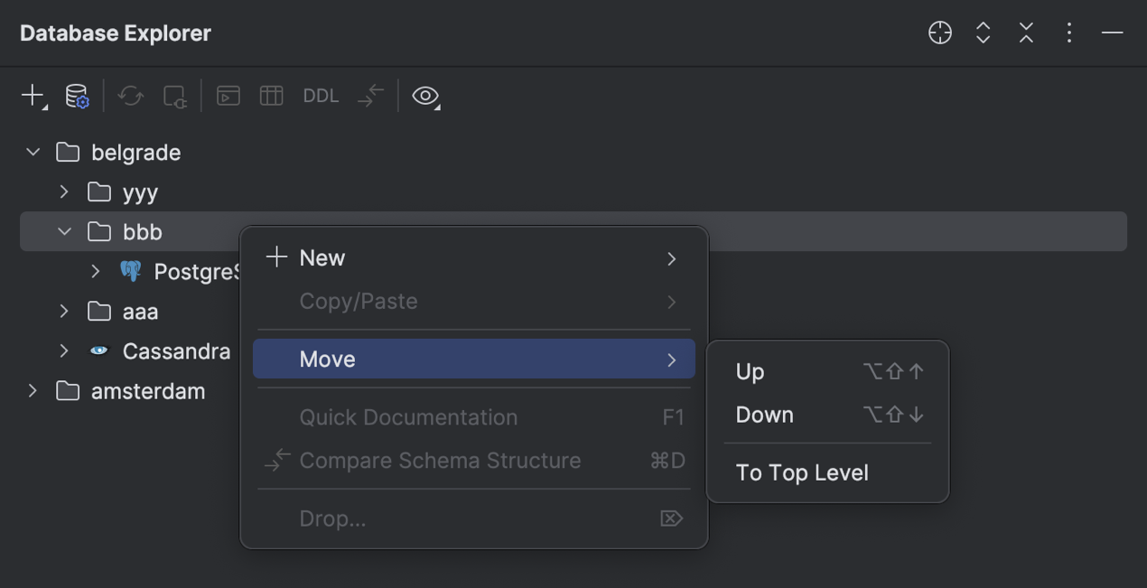 We’ve redesigned the folders in the database explorer so that you can rearrange them in any way that works for you. You can now also create empty folders. Pre-existing folders from the previous version are automatically converted to the new configuration. The configuration of the folders is stored in .idea/db-forest-config.xml.