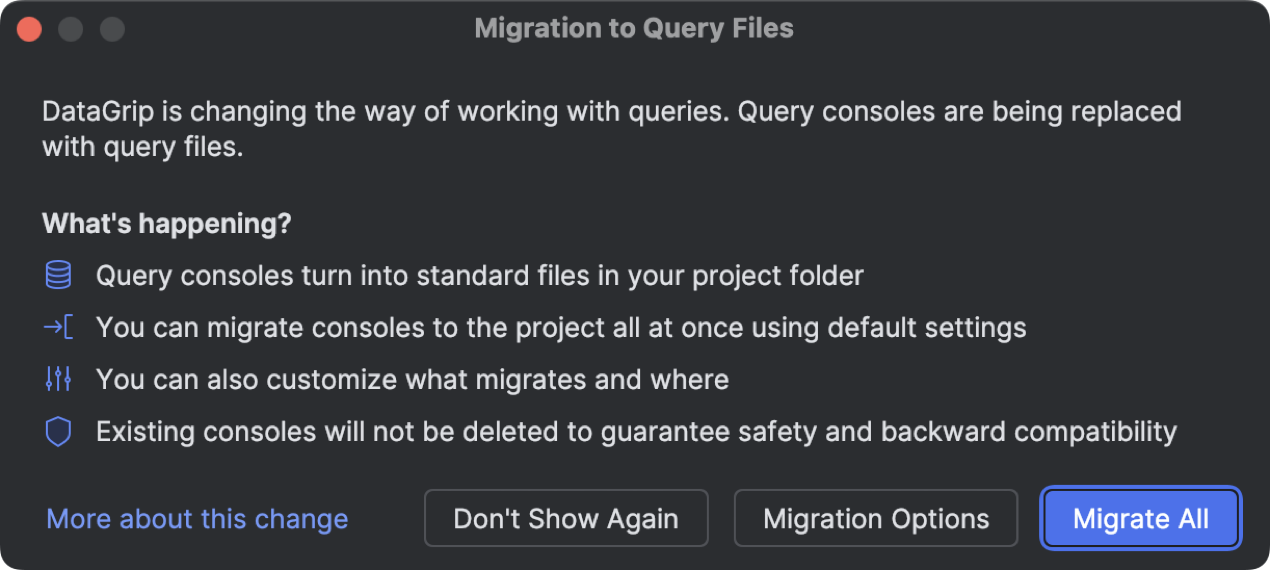 Previously, when referring to the SQL files that are attached to a data source by default, we used the term query console, and their workflow had a few issues. We’ve switched to the term query files, which reflects their nature more of these files properly. These files will now be part of your IDE project, but you’ll have to carry out a migration step first.