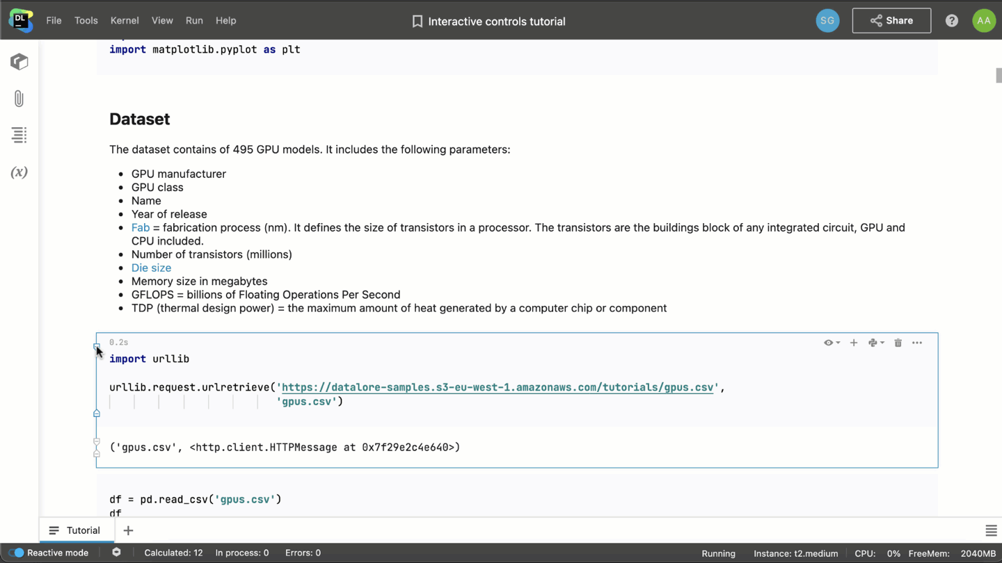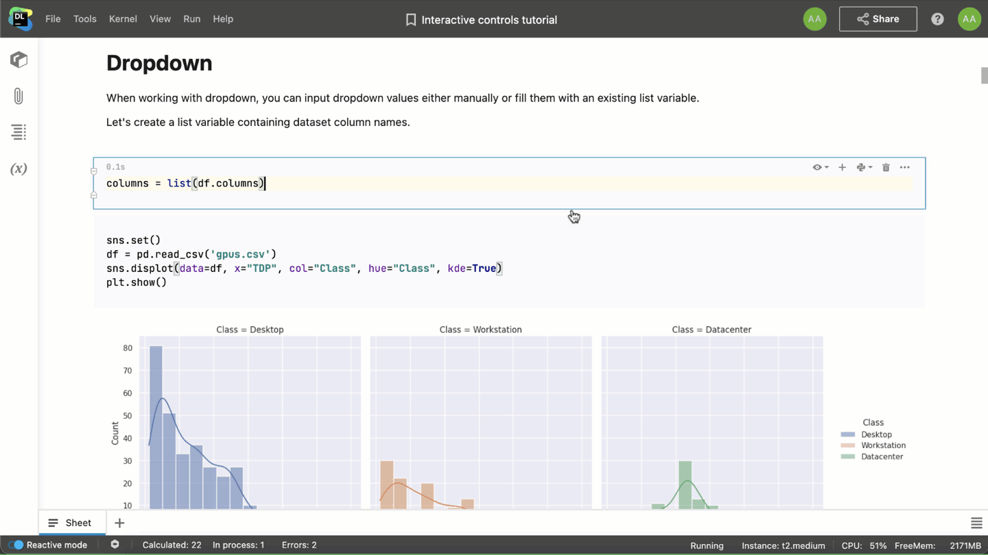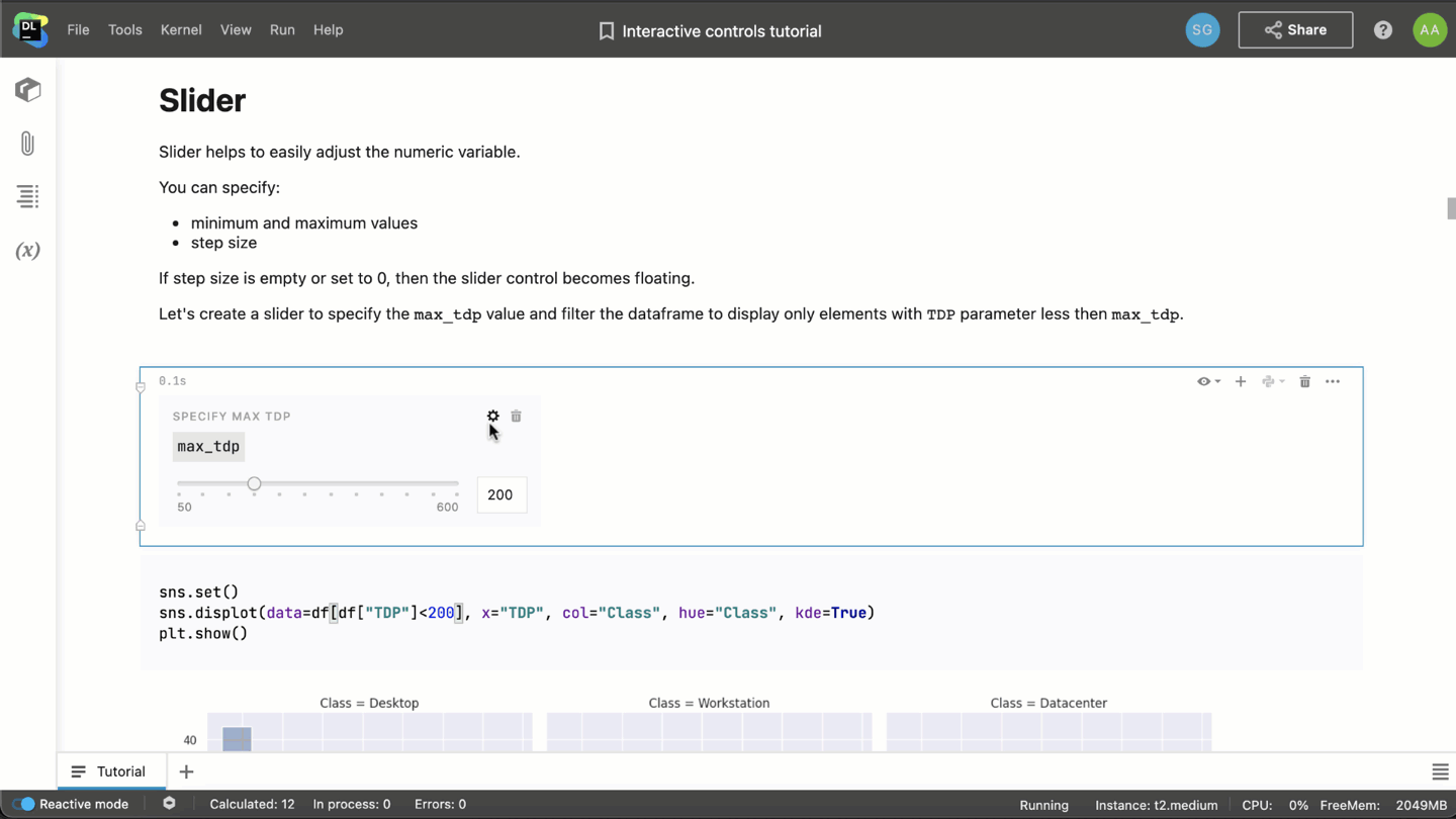 💡 Tip: Make sure to switch on the Reactive mode from the Datalore kernel. It will recompute all the dependent cells on the fly and you won’t have to click the run button when you change the control value.