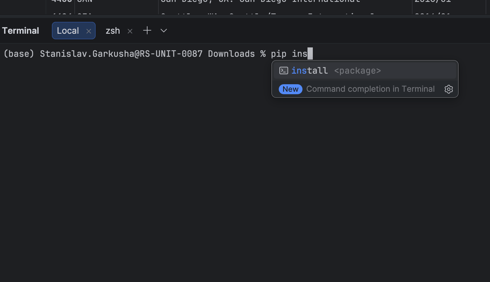 Terminal completion makes working with command-line tools inside the IDE faster and more convenient.