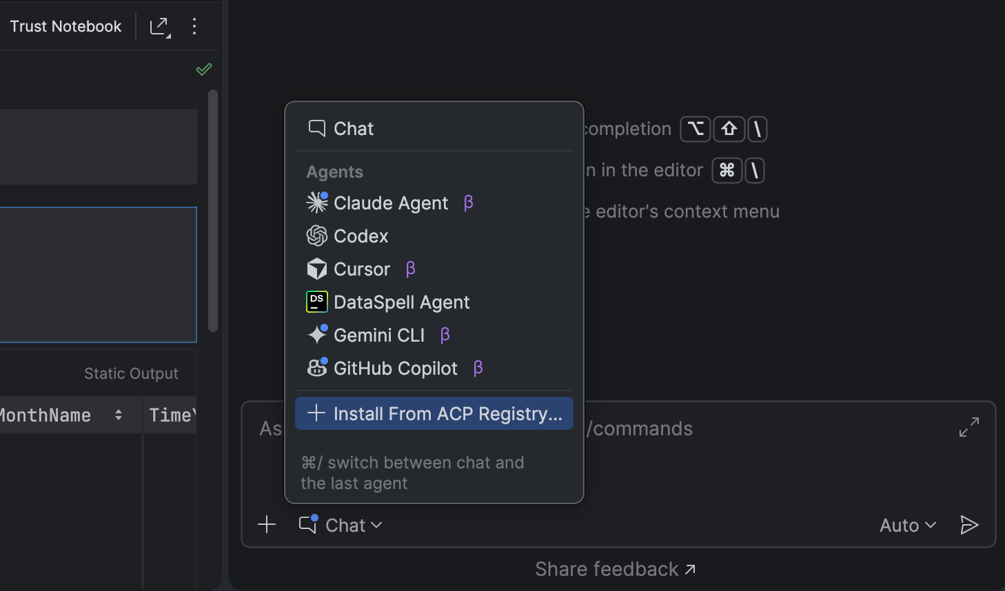With the 2026.1 release, DataSpell continues to improve the way you explore data, work with notebooks, and integrate AI into your workflows. This update expands the AI ecosystem with new agents support and brings several productivity improvements throughout the IDE.