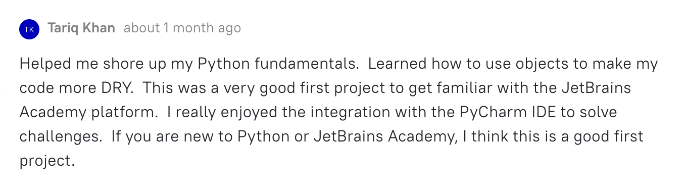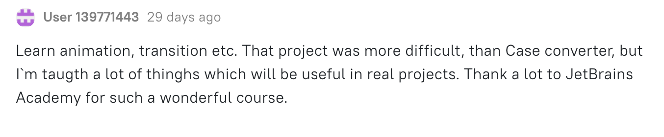 Ohne uns selbst loben zu wollen, hat sich unser Team im Jahr 2021 selbst übertroffen. Wir haben 78 neue Projekte entwickelt und 424 neue Bildungsthemen veröffentlicht! Als Lerngemeinschaft haben Sie mehr als 178.000 Kommentare in JetBrains Academy hinterlassen, was uns sehr wichtig ist. Sie helfen sich gegenseitig bei der Fehlersuche, lösen schwierige Aufgaben, geben Tipps, bitten um Rat und unterstützen sich gegenseitig. Es erstaunt uns, wie stark unsere Community geworden ist, und wir danken euch dafür.
