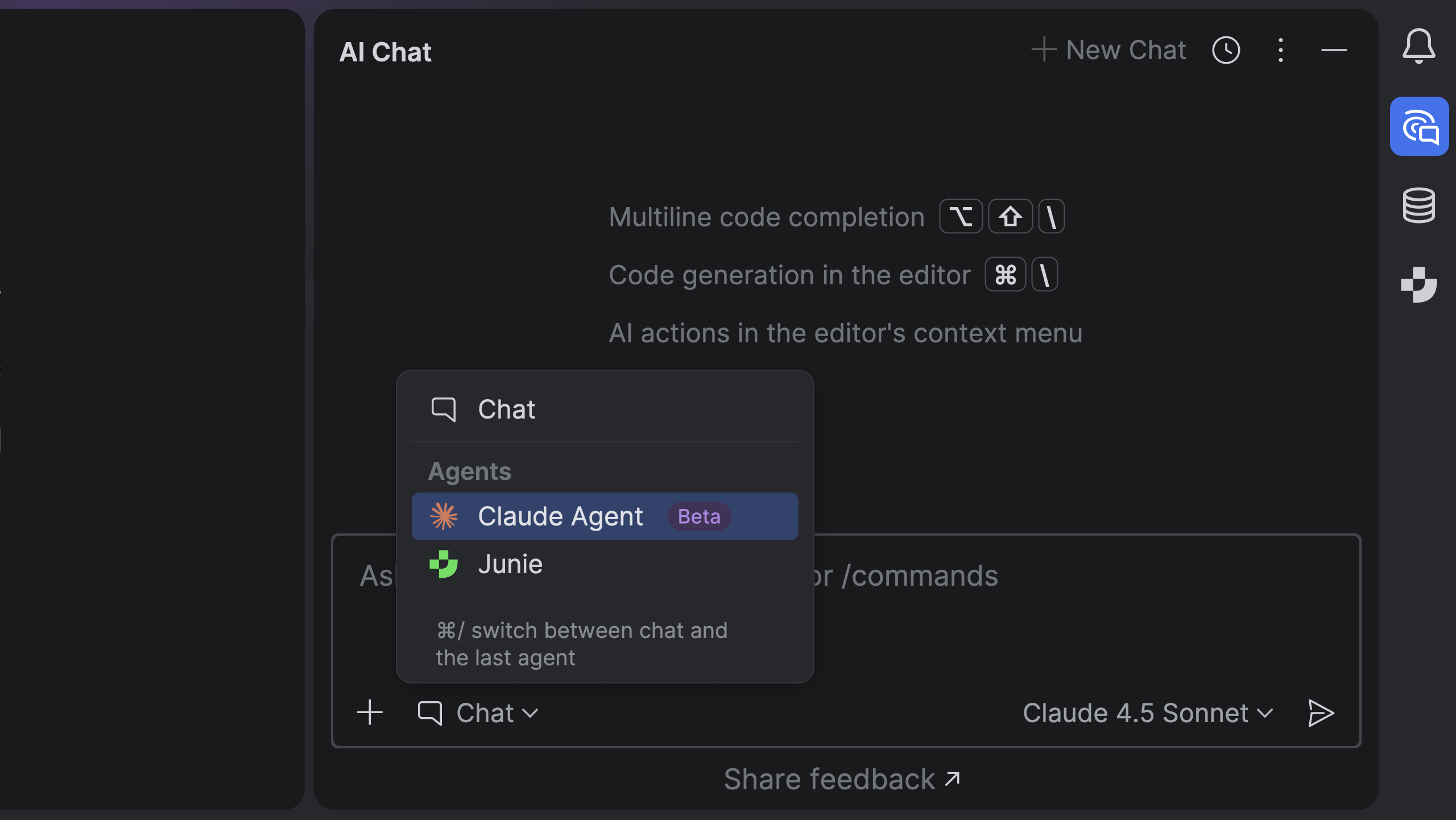 Der unkomplizierteste Weg, mit einem Agent zusammenzuarbeiten, besteht darin, ihn direkt über den KI-Chat zu starten. Das Junie-Plugin (und einige exklusive Features) steht Ihnen jedoch weiterhin zur Verfügung, wenn Sie diesen Ansatz bevorzugen.