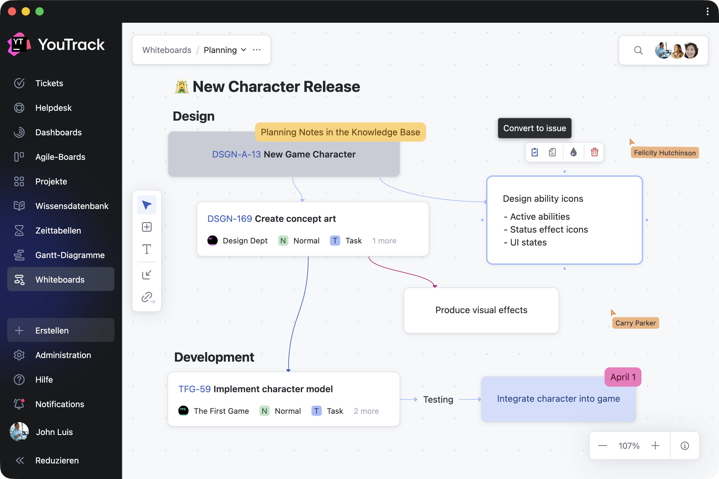Sie können Ideen sammeln und in Echtzeit auf einem gemeinsamen Whiteboard visualisieren. Sobald die festgehaltenen Ideen umsetzungsreif sind, können sie in Aufgaben und Artikel mit vorkonfigurierten Abhängigkeiten umgewandelt werden, mit vollständiger Integration in den Kontext Ihres YouTrack-Projekts.
