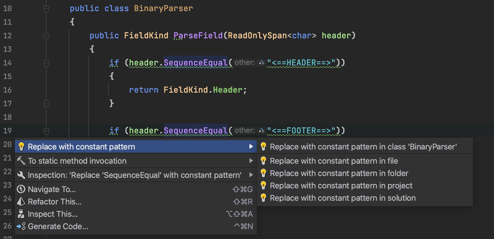 Rider now has a code inspection that will suggest replacing span.SequenceEqual("stringLiteral")