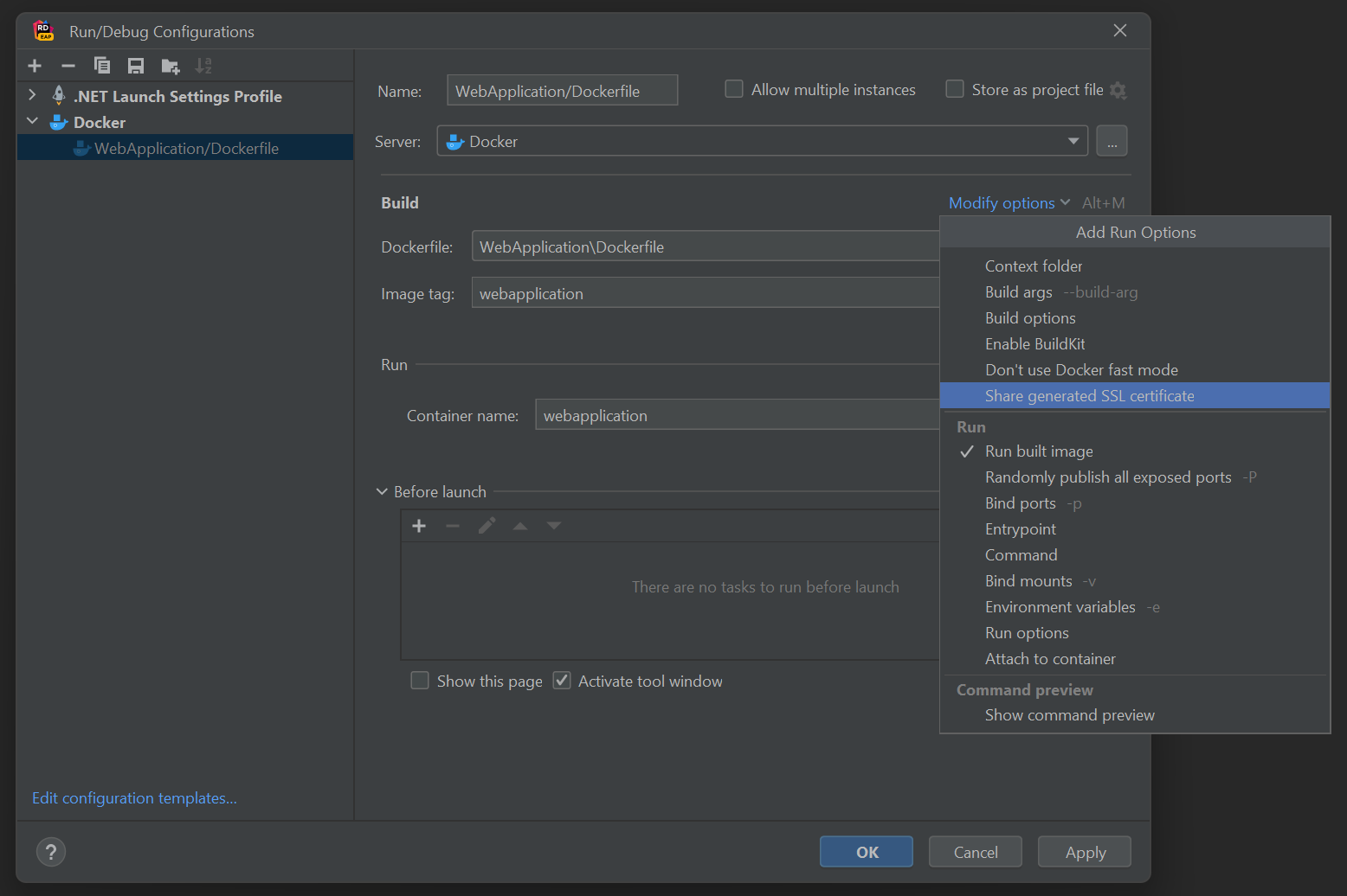 Whenever you deploy an application to Docker in Fast mode, you need to share the generated HTTPS development certificates between the host and the container. We’ve automated this step by adding a Share generated SSL certificate option for Docker run configurations. If you select that option, the development certificate will be exported with a password, which will be stored in the .NET user secrets store, and two volumes of the certificate will be mounted to the container.