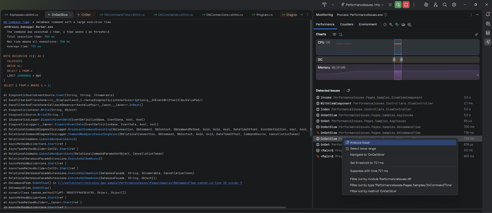 With the inclusion of Database and ASP.NET issue detection, the tool automatically highlights slow queries, excessive database connections, or long-running MVC actions and Razor handlers. These now appear alongside other runtime insights such as UI freezes, GC pressure, and performance hotspots.