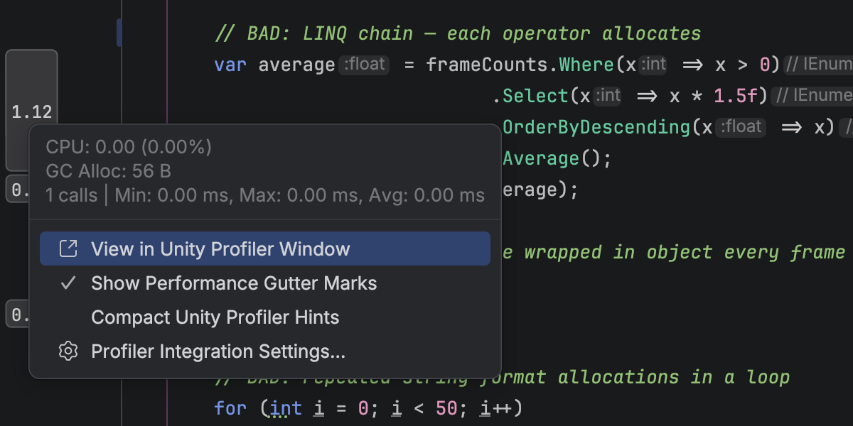 You can open Unity Profiler snapshots directly in Rider and explore them in a dedicated tool window with a structured view of frames and call stacks. A timeline graph helps you identify performance hotspots, and you can navigate directly from profiler data to source code.