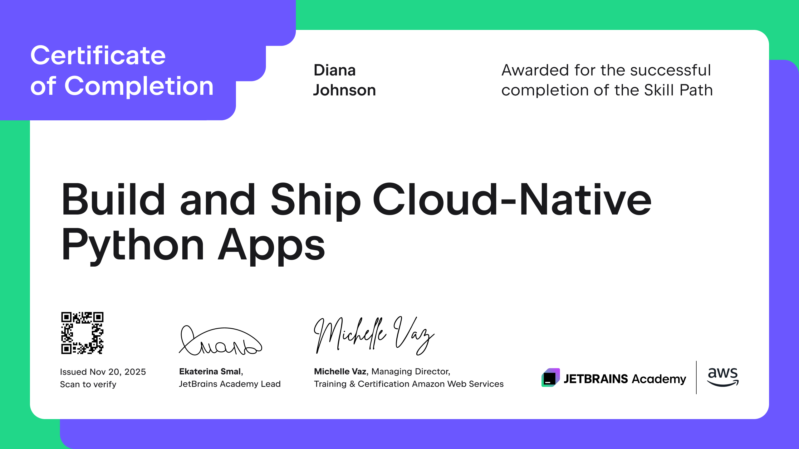Learners have already earned more than 40 certificates co-branded by JetBrains Academy and AWS. Get yours by completing the course – a strong addition to your LinkedIn profile or portfolio.