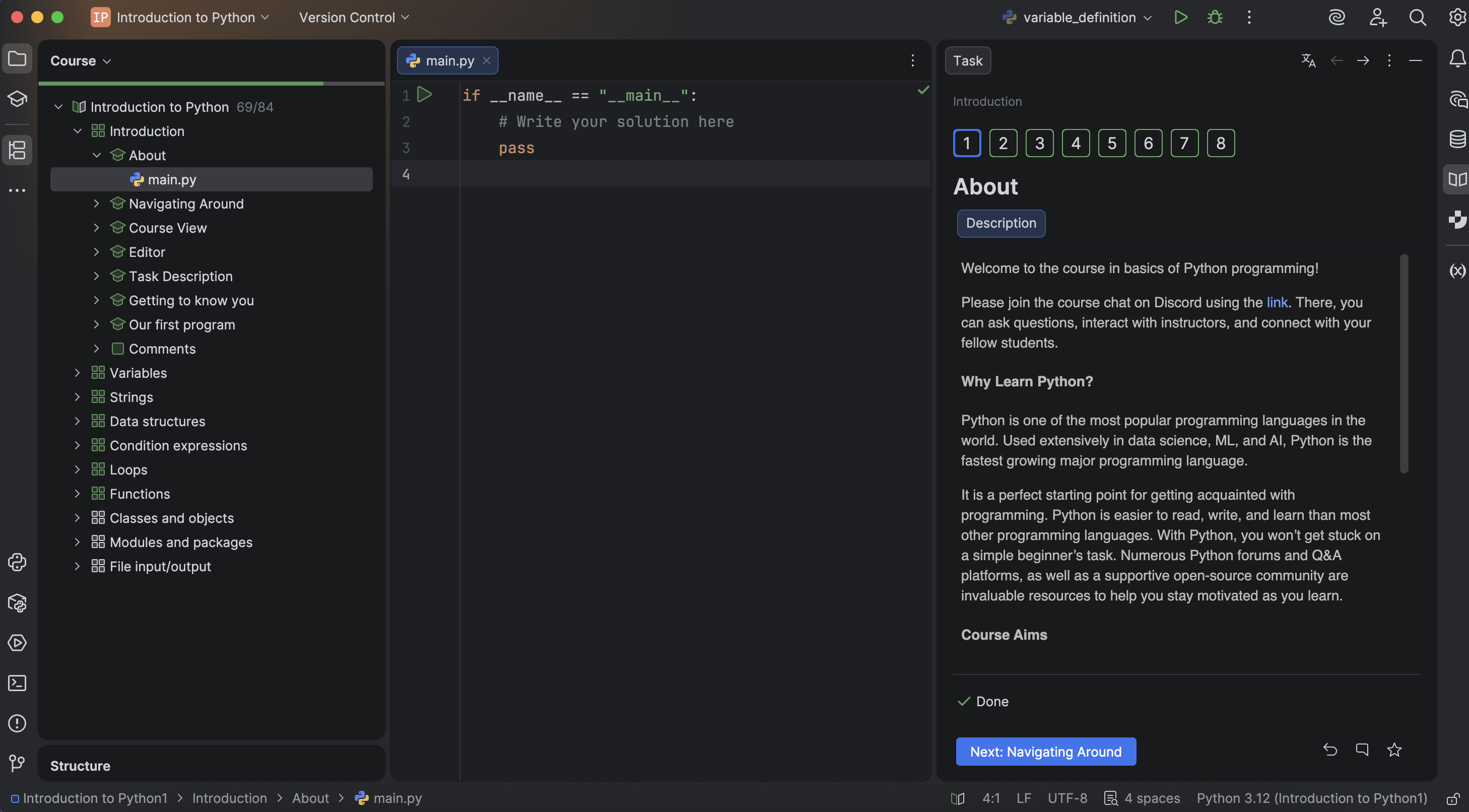 Our in-IDE courses are built directly inside the tools developers use every day, so you learn by doing – writing real code, solving real tasks, and building skills that are sought after by employers. All in-IDE courses are free of charge, and as a student, you can apply for the JetBrains Student Pack and get a free licence for JetBrains IDEs.