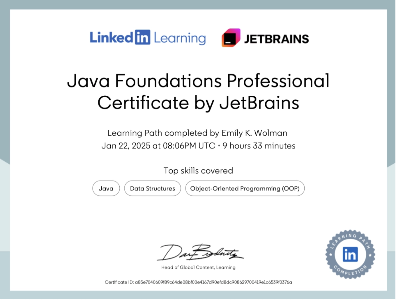 That’s why JetBrains has partnered with LinkedIn to offer the Java Foundations Professional Certificate, exclusively on LinkedIn Learning. By completing this learning path, you’ll enhance your LinkedIn profile, validate your Java skills, and get real-world experience. You’ll work in IntelliJ IDEA, the industry’s leading IDE for Java development, gaining practical knowledge essential for your career. By the end of the series, you’ll have acquired the skills to apply for junior developer positions directly on LinkedIn.