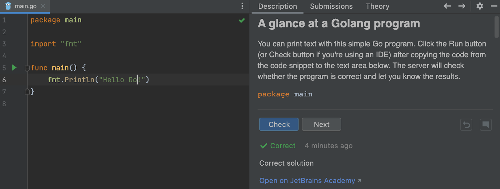 Votre progression est synchronisée entre GoLand et la plateforme en ligne. Ainsi, si vous changez d’avis et souhaitez utiliser votre navigateur, vous pouvez reprendre exactement là où vous vous êtes arrêté dans l’IDE.