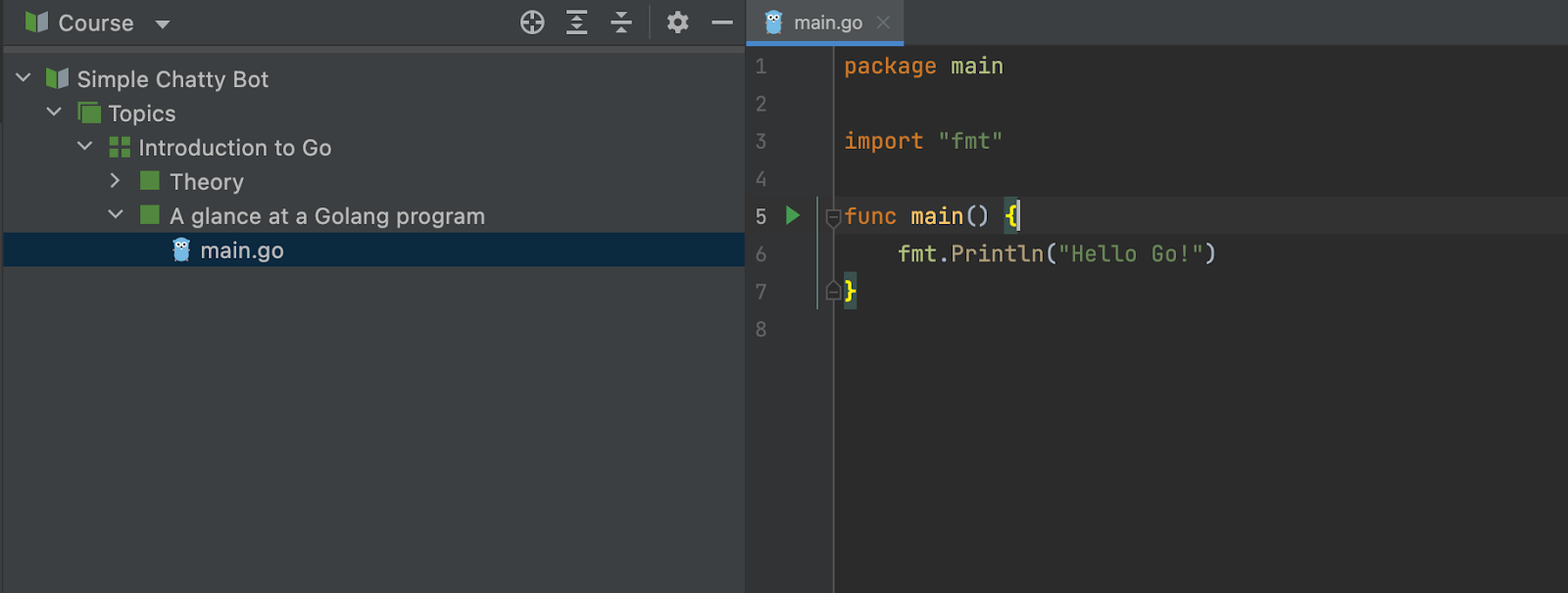 Dans GoLand, vous pouvez travailler sur votre programme dans l’éditeur de code au centre de l’IDE tout en lisant le cours théorique dans la partie droite de la fenêtre.