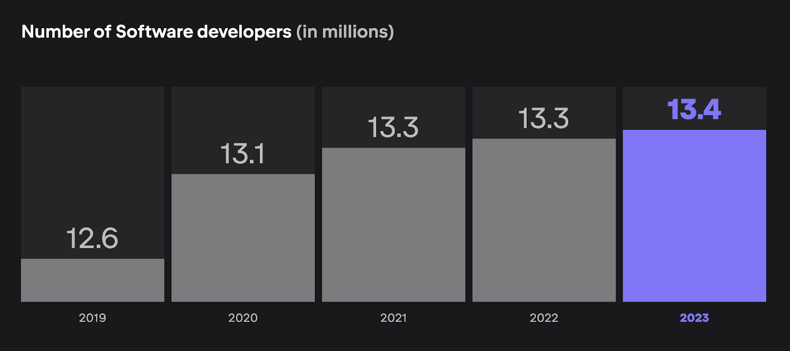 Le secteur de l’informatique a connu une croissance significative au cours des dernières années et notre modèle interne estimait qu’il y avait environ 13,4 millions de développeurs professionnels dans le monde en 2023. Ce modèle, le Data Playground, utilise les données les plus récentes provenant d’organisations internationales dans le domaine de l’emploi et de notre étude annuelle sur l’État de l’Écosystème des développeurs.