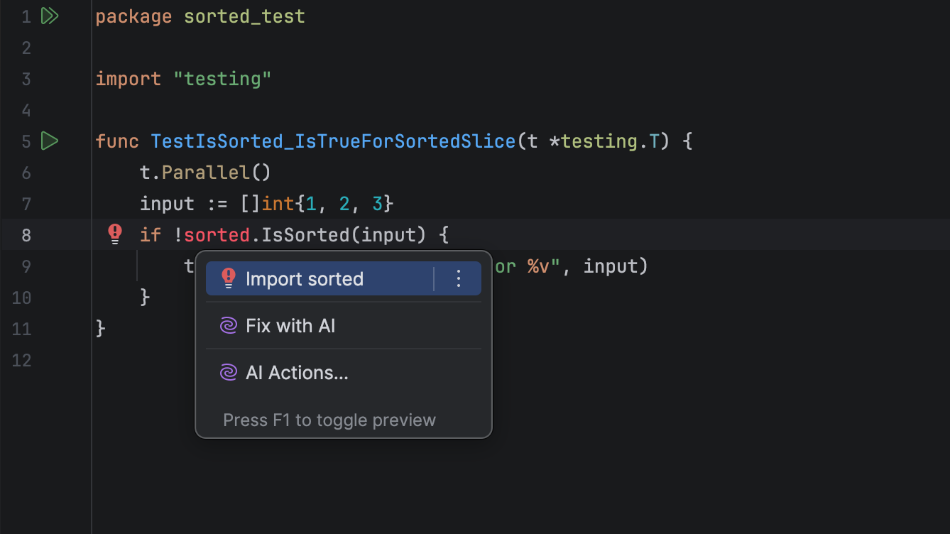 Now we have a quick-fix action available in the test: import sorted. Great!