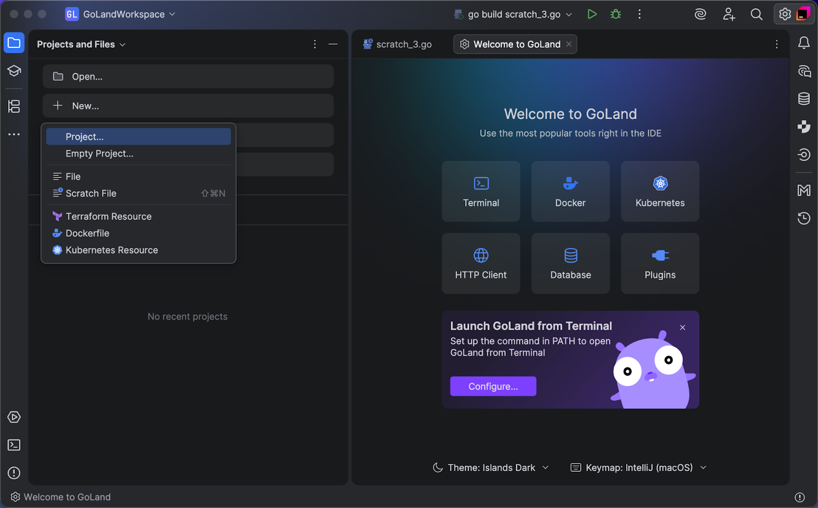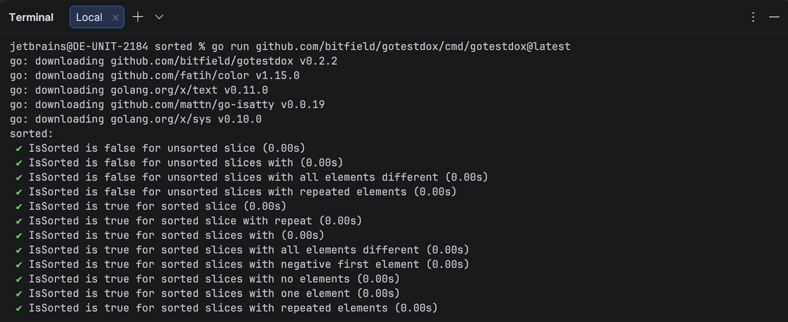 We’ll start by imagining that we already have the IsSorted function, and we’ll try to write a test for it. Once we have the test, we’ll go on to write the function.Let’s fire up GoLand and select File / New / Project… / sorted.