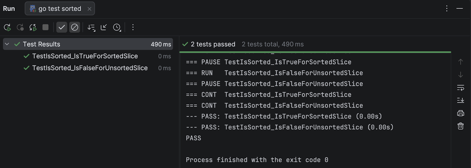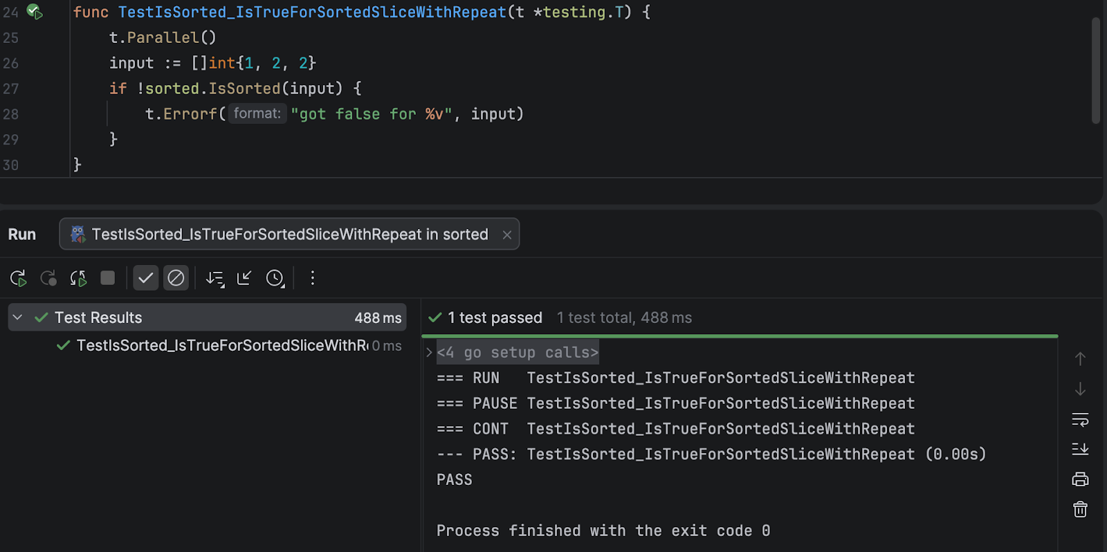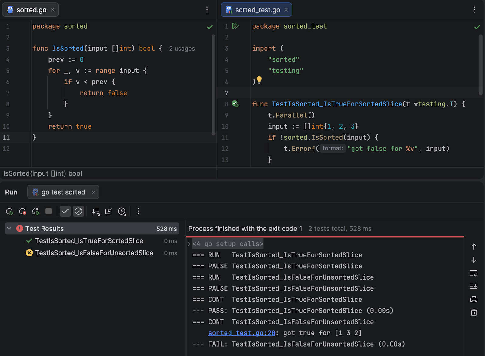 We could trivially change IsSorted to return true instead of false to make this pass, but that doesn’t really get us anywhere. IsSorted needs to be able to distinguish between sorted and unsorted slices, not just return a fixed value.