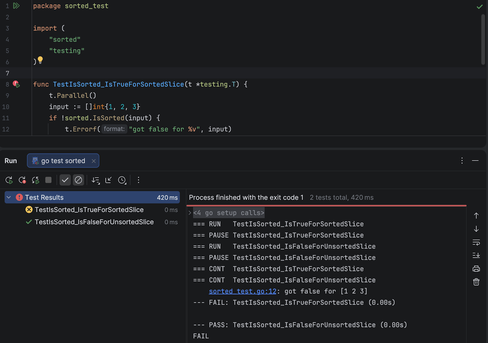 sorted_test.go:12: got false for [1 2 3] --- FAIL: TestIsSorted_IsTrueForSortedSlice (0.00s)
