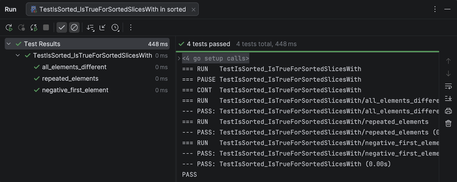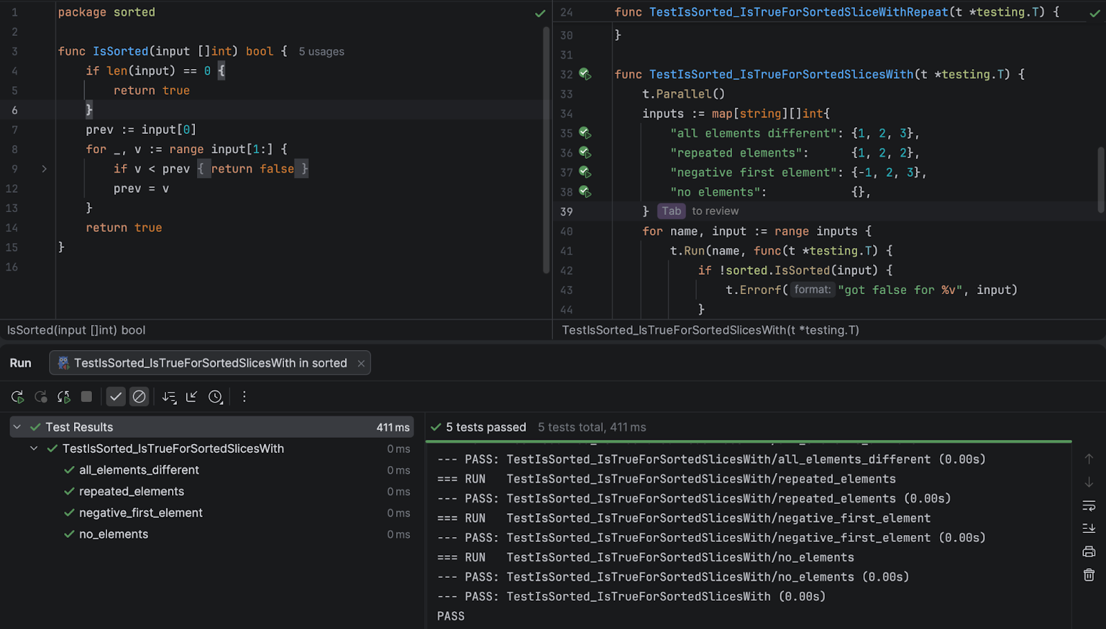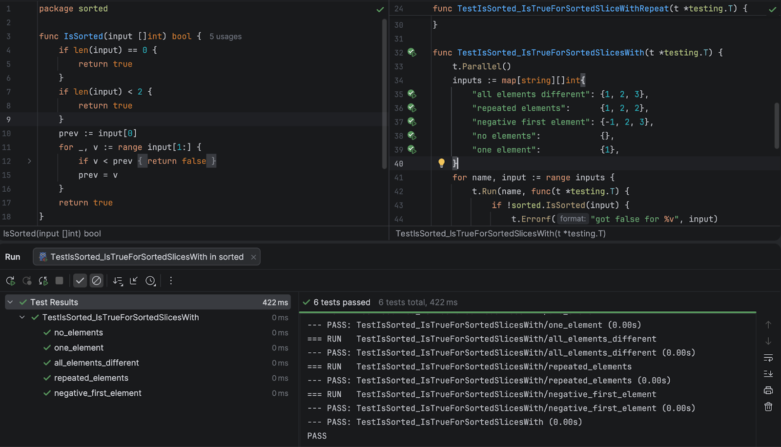 GoLand can write this table test for us, if we right-click on the IsSorted function and select Generate / Test for function:
