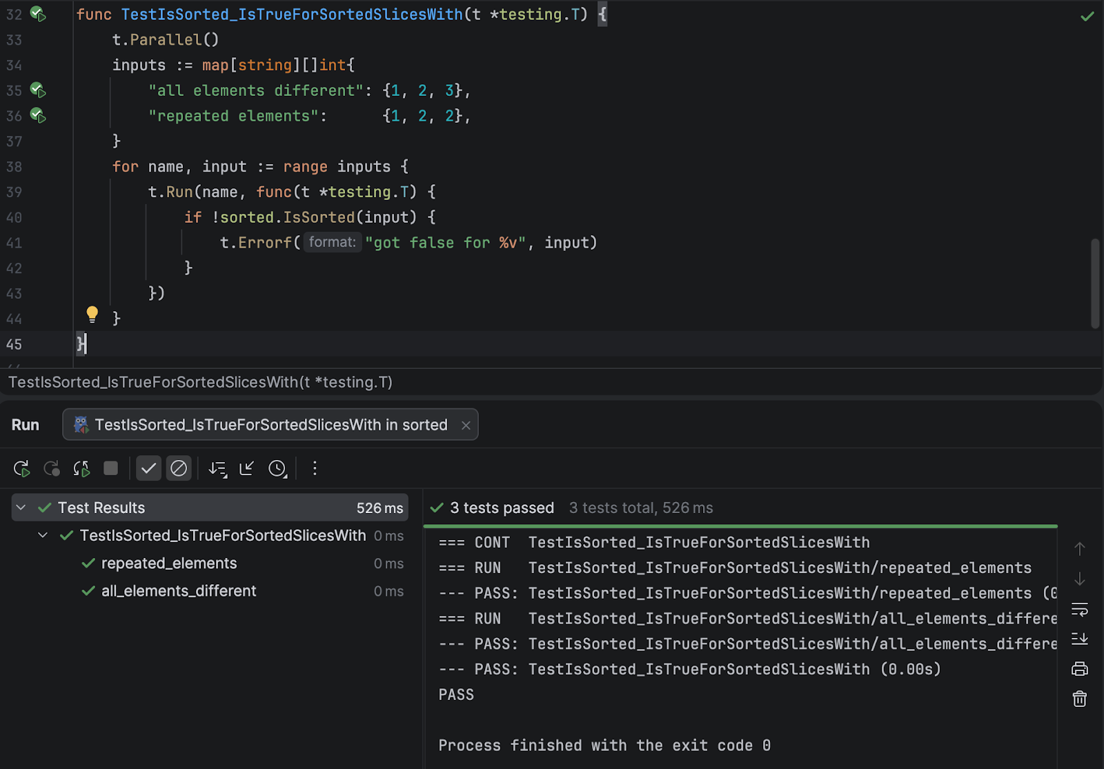 This passes, which is encouraging. But I notice that the test logic is the same for all our “sorted” tests, so let’s combine them into a single table test.