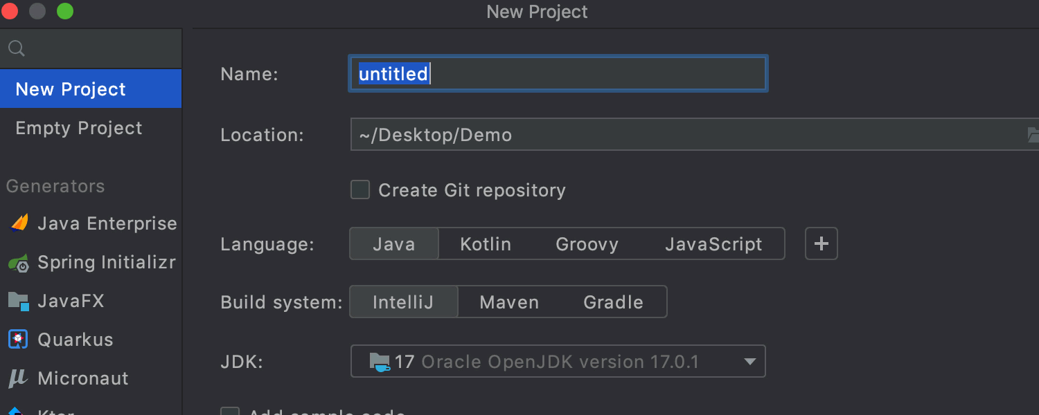To quickly launch a simple Java, Kotlin, Groovy, or JavaScript project, use the New Project tab and pre-configure your project by selecting the required combination of language, build system, and project SDK. You can also create a Git repository for your project and install plugins here, if needed.