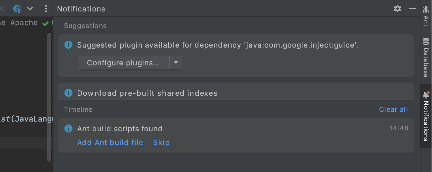 All notifications that appear in the Notifications tool window are sorted into two types: Suggestions and Timeline.