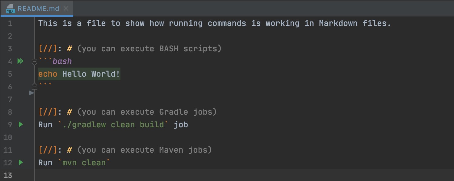 If a Markdown file contains instructions with commands that you need to execute in your terminal, you can run those commands directly from the Markdown file using the run icons in the gutter.