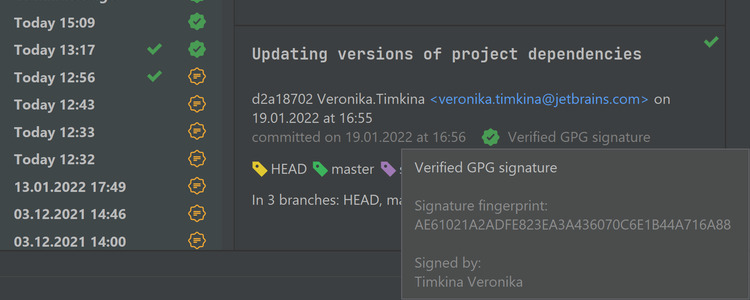 The Commit details pane now includes information about GPG signatures and build status. Previously, this data was shown only as a column in the Git log.