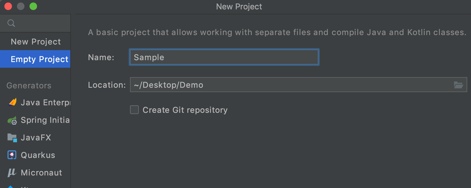 With the Empty Project tab, you can quickly start a basic project to work with different languages or Java/Kotlin classes without a predefined SDK, which could be useful for ad-hoc developing, creating mockups, and testing.