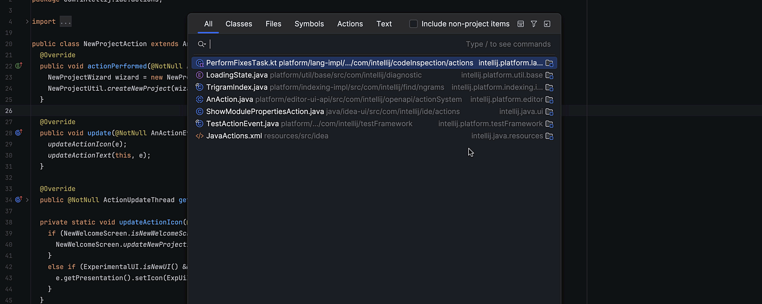 The Search Everywhere dialog now includes an option to preview the codebase elements you’re searching for. Enabling this feature through the Preview icon on the dialog’s toolbar will cause a preview pane to appear under the search results, offering additional context and making it easier to navigate through your project.