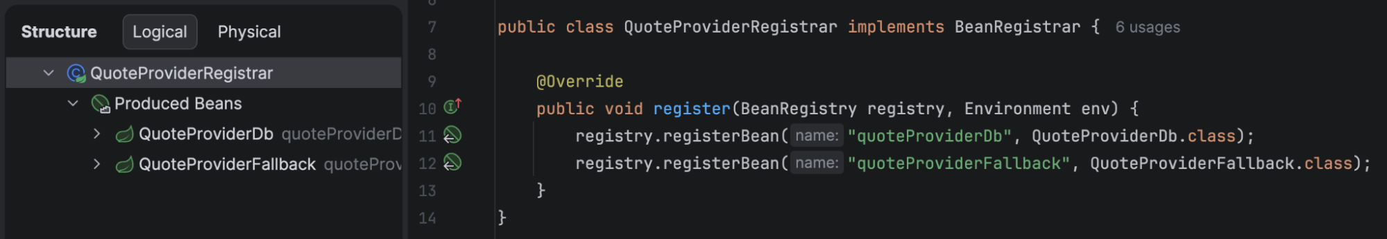 If your bean construction logic gets complex or depends on multiple factors, programmatic bean registration is a neat way to handle it. IntelliJ IDEA recognizes these beans dynamically, so you won’t see those annoying “unresolved injection” warnings anymore. You can navigate straight from the injection point right to the registrar – those familiar little green bean icons in the gutter have got you covered.