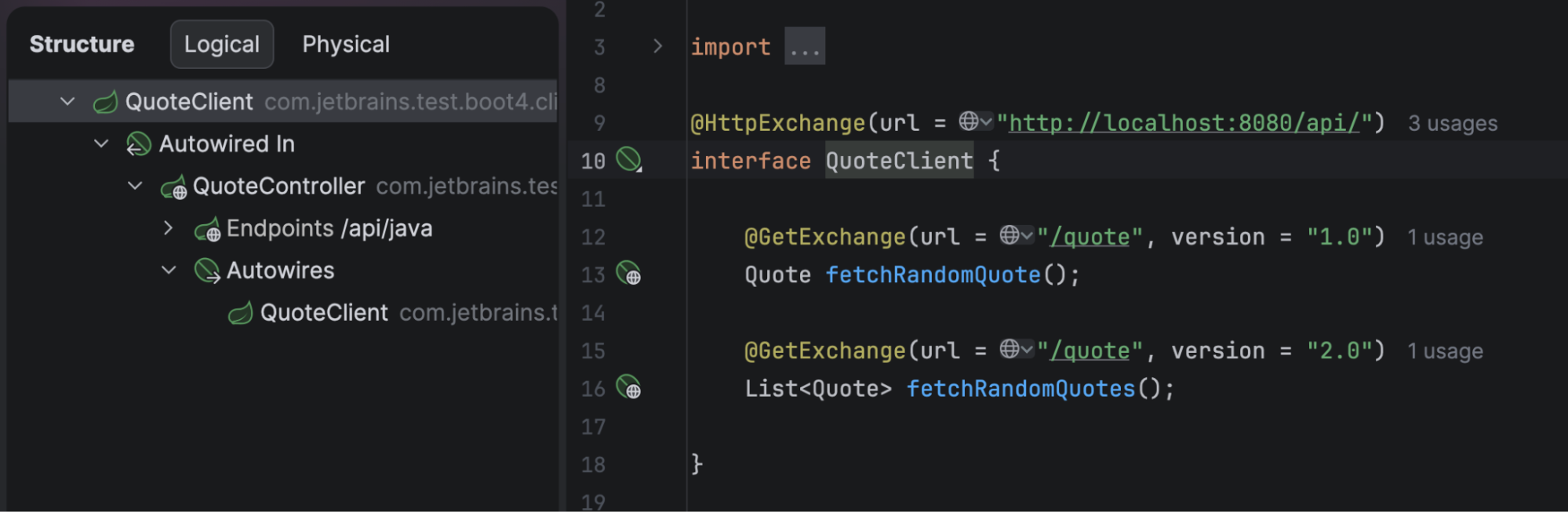 IntelliJ IDEA 2025.3 recognizes HTTP interfaces as beans – no more “red squiggly lines” or “cannot resolve bean” warnings. You get full autocompletion, navigation, and injection support wherever these clients are used.